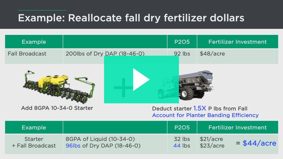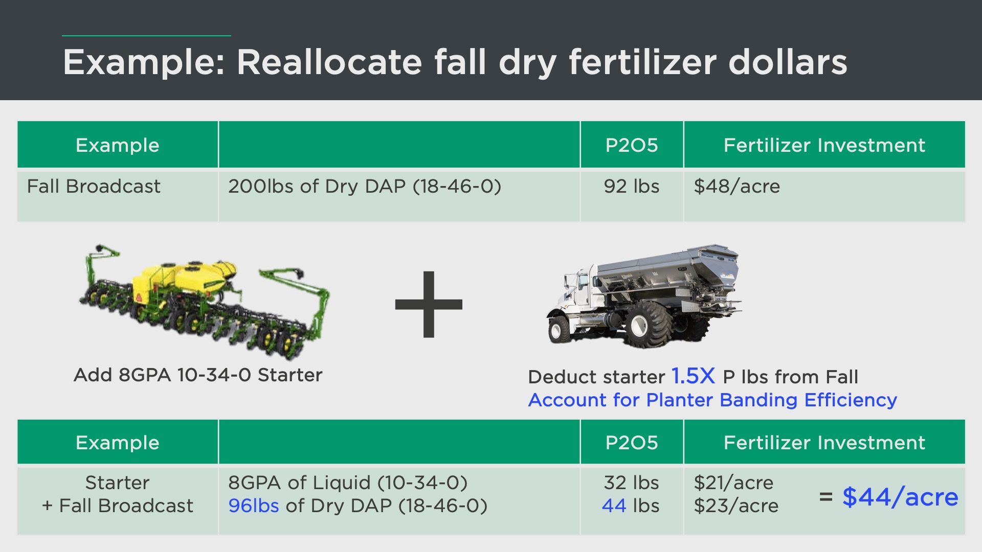 Phosphorus fertilizer does not move in the soil, which means that it needs to be placed where a plant will be able to access it. Broadcasting the immobile nutrient across the entire field doesn’t make sense, because it won’t move to the rows where the plants are.